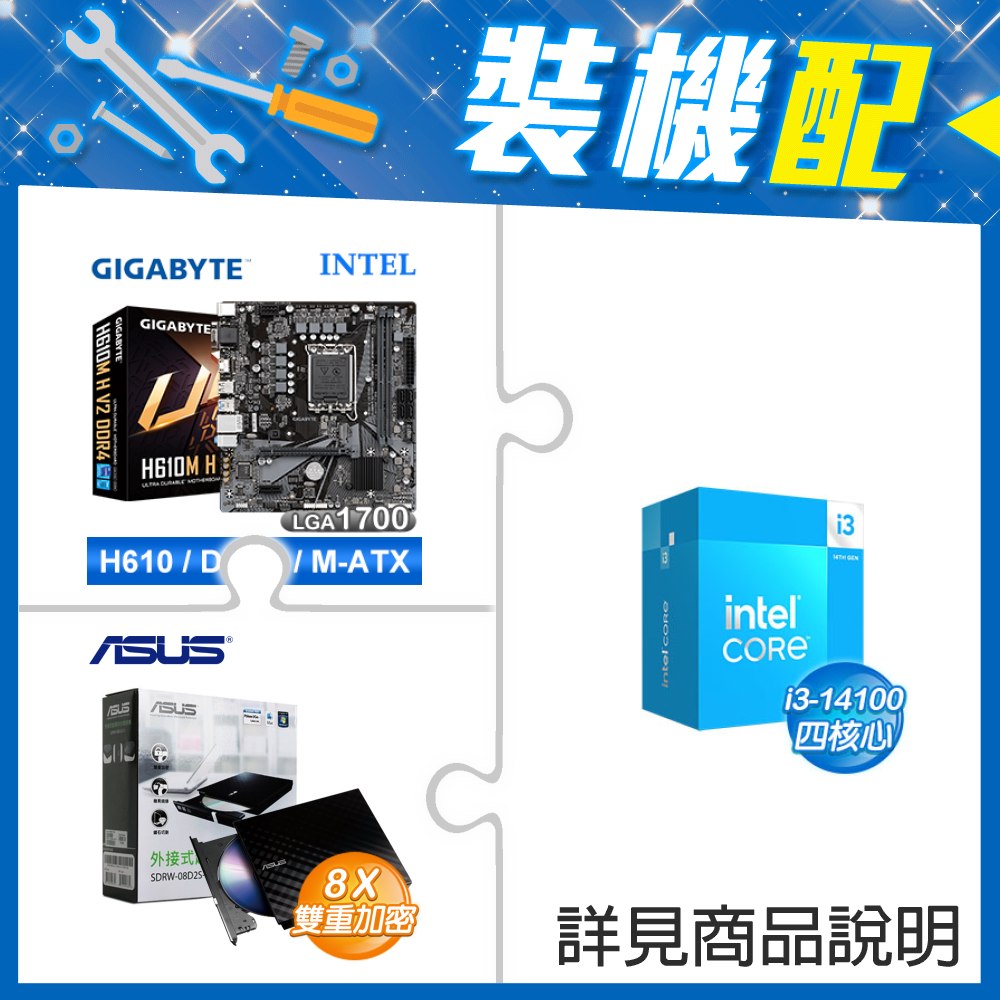 ☆裝機配★ i3-14100+技嘉 H610M H V2 D4 MATX主機板+華碩 SDRW-08D2S-U 外接式燒錄機《黑》