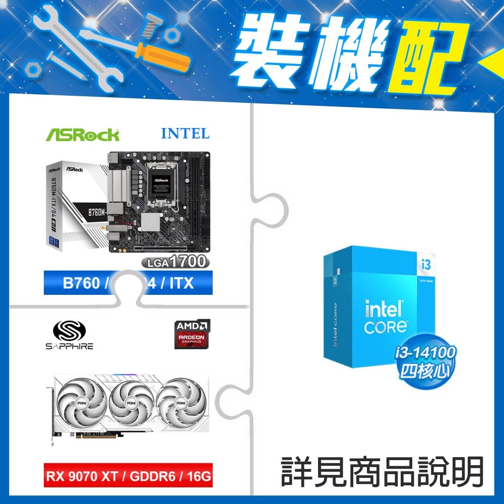 ☆裝機配★ i3-14100F+華擎 B760M-ITX/D4 WiFi ITX主機板+藍寶石 PURE 極地 RX 9070 XT GAMING OC 16GB 顯示卡