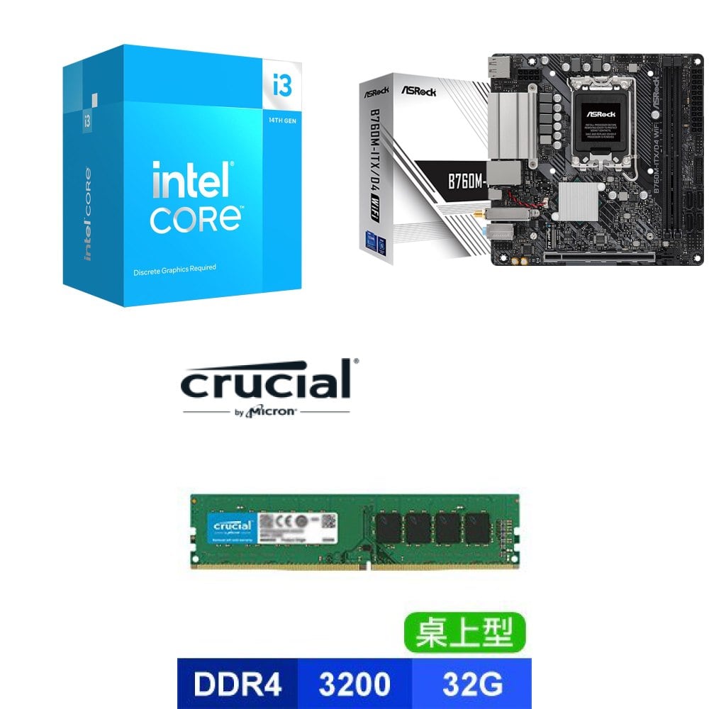 ☆裝機配★ i3-14100F+華擎 B760M-ITX/D4 WiFi ITX主機板+美光 DDR4-3200 32G 記憶體