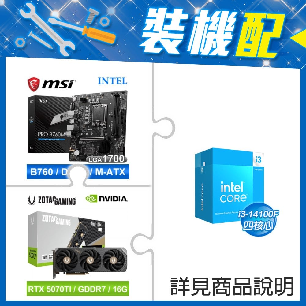 ☆裝機配★ i3-14100F+微星 PRO B760M-E D5 MATX主機板+索泰 RTX 5070 TI SOLID CORE OC 16G 顯示卡