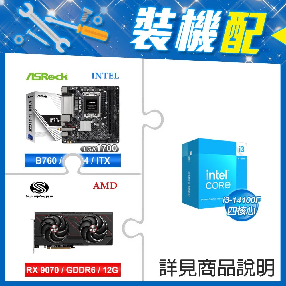 ☆裝機配★ i3-14100F+華擎 B760M-ITX/D4 WiFi ITX主機板+藍寶石 PULSE 脈動 RX 9070 GRE GAMING 12GB 顯示卡