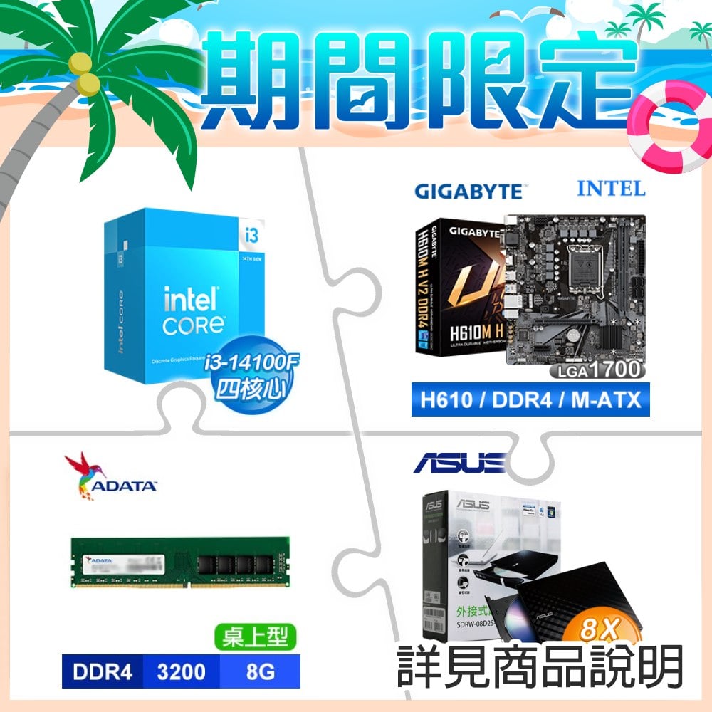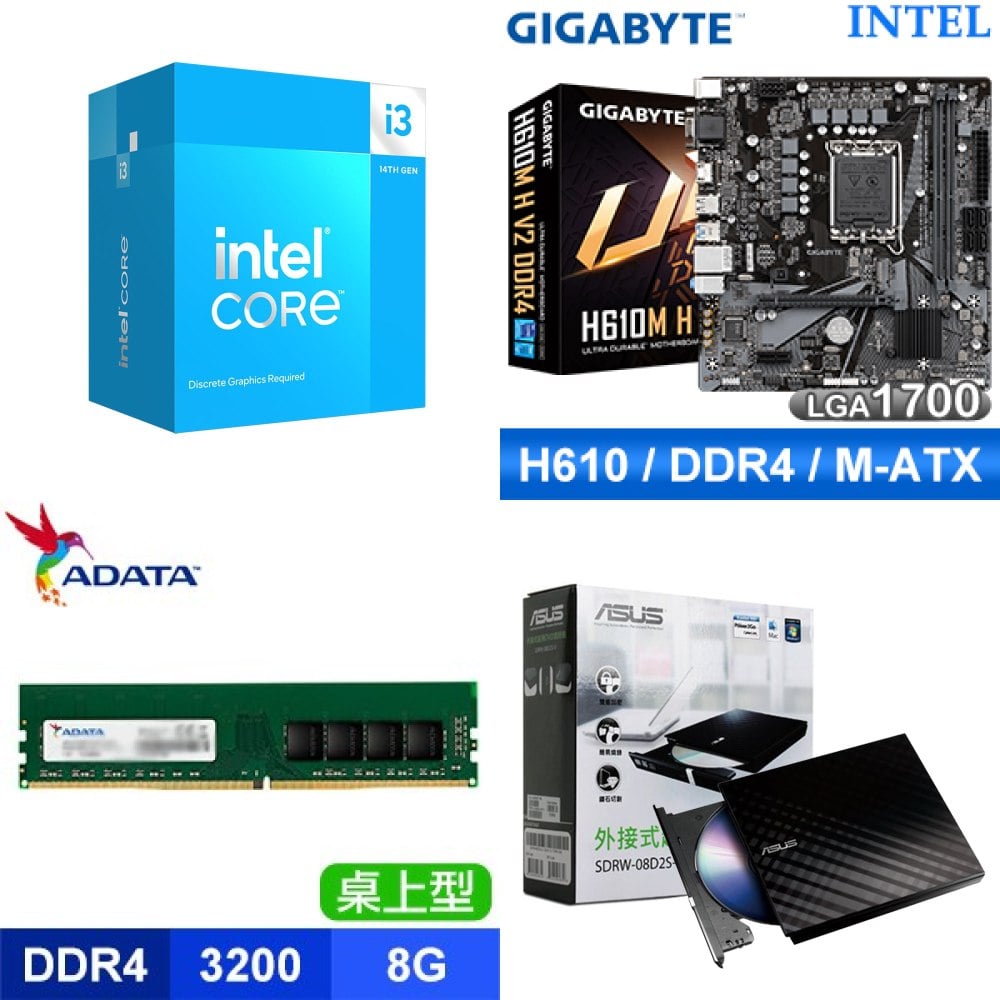 ☆期間限定★ i3-14100F+技嘉 H610M H V2 D4 M-ATX主機板+威剛 DDR4-3200 8G 記憶體+華碩 外接燒錄器《黑》(SDRW-08D2S-U)