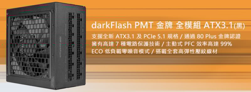 - 電源供應器:darkFlash 大飛 PMT 850W 金牌 全模組 ATX3.1 黑