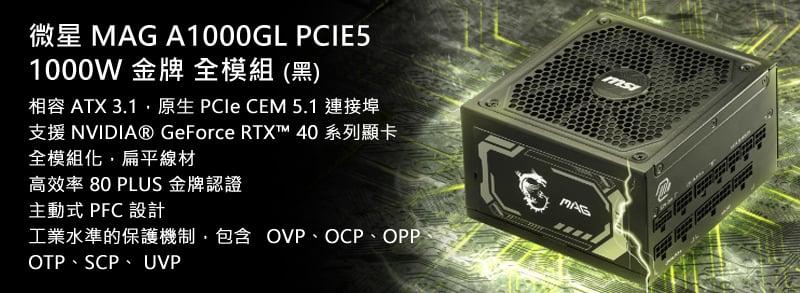 - 電源供應器:微星 MAG A1000GL PCIE5 1000W 金牌 全模組 ATX3.1