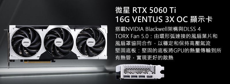 - 顯示卡:微星 RTX 5060 Ti 16G VENTUS 3X OC