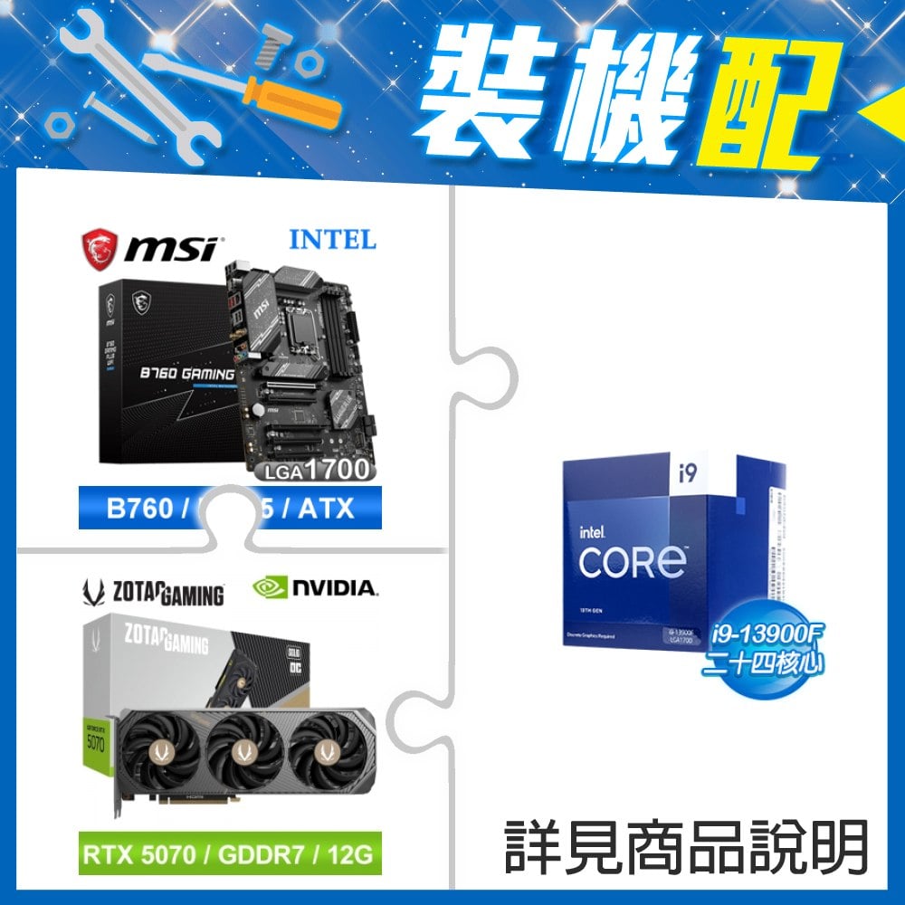 ☆裝機配★ i9-13900F《無內顯》+微星 B760 GAMING PLUS WIFI D5 ATX主機板+索泰 RTX 5070 SOLID OC 12G 顯示卡