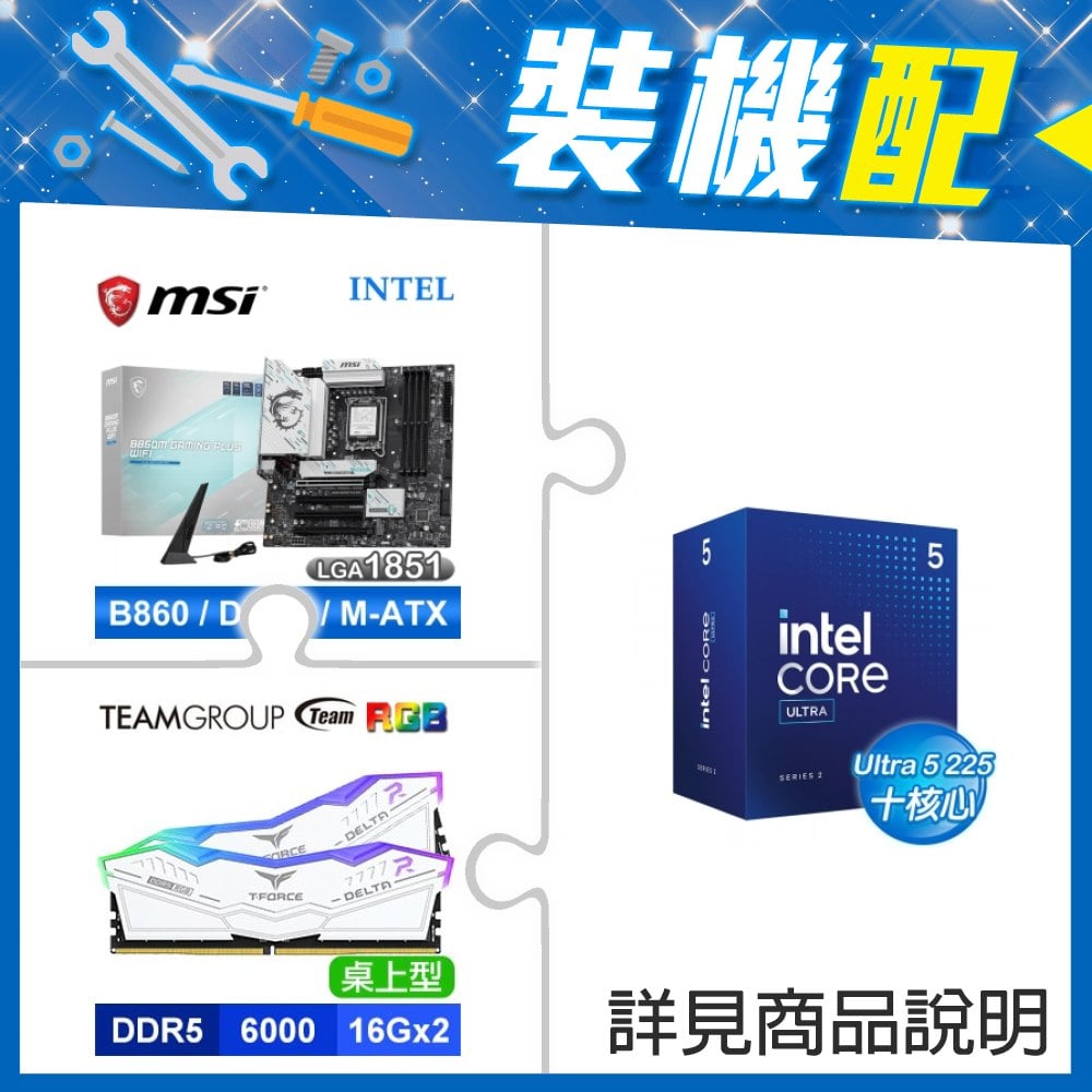 ☆裝機配★ Core U5 225F+微星 B860M GAMING PLUS WIFI D5 MATX主機板+十銓 T-FORCE DELTA RGB DDR5-6000 16G*2 CL30 記憶體《白》