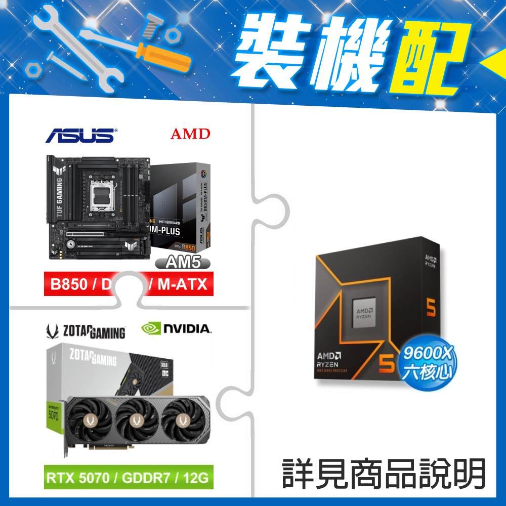 ☆裝機配★ AMD R5 9600X+華碩 TUF GAMING B850M-PLUS MATX主機板+索泰 RTX 5070 SOLID OC 12G 顯示卡