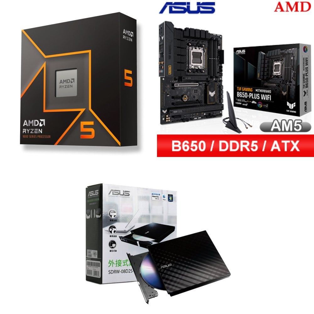 ☆裝機配★ AMD R5 9600X+華碩 TUF GAMING B650-PLUS WIFI ATX主機板+華碩 SDRW-08D2S-U 外接式燒錄機《黑》
