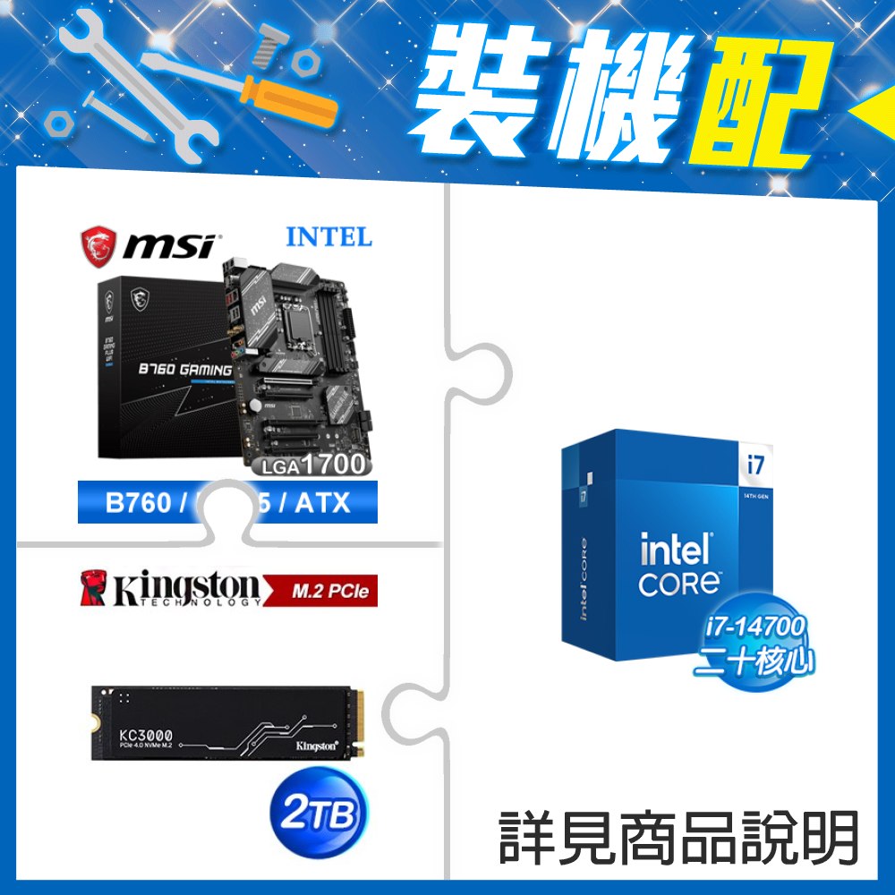 ☆裝機配★ i7-14700F+微星 B760 GAMING PLUS WIFI D5 ATX主機板+金士頓 KC3000 2TB PCIe 4.0 NVMe M.2 SSD
