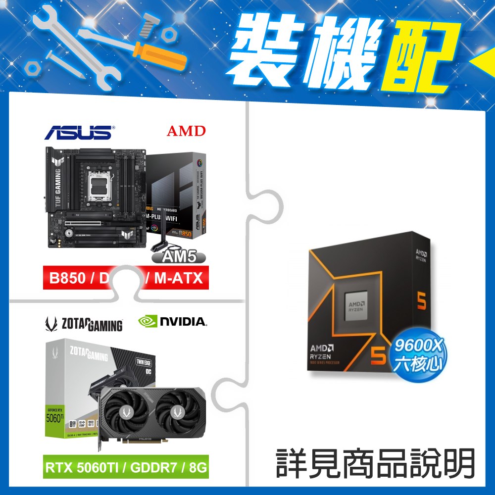 ☆裝機配★ AMD R5 9600X+華碩 TUF GAMING B850M-PLUS WIFI MATX主機板+索泰 RTX 5060 TI 8GB Twin Edge OC 顯示卡