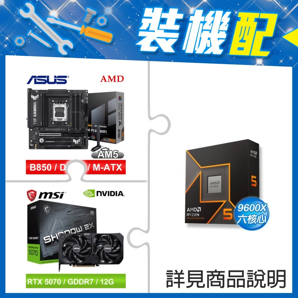☆裝機配★ AMD R5 9600X+華碩 TUF GAMING B850M-PLUS WIFI MATX主機板+微星 RTX 5070 12G SHADOW 2X OC 顯示卡