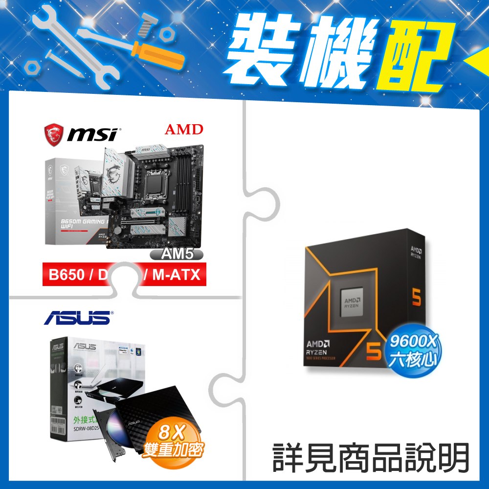 ☆裝機配★ AMD R5 9600X+華碩 TUF GAMING B650-E WIFI ATX主機板+華碩 SDRW-08D2S-U 外接式燒錄機《黑》
