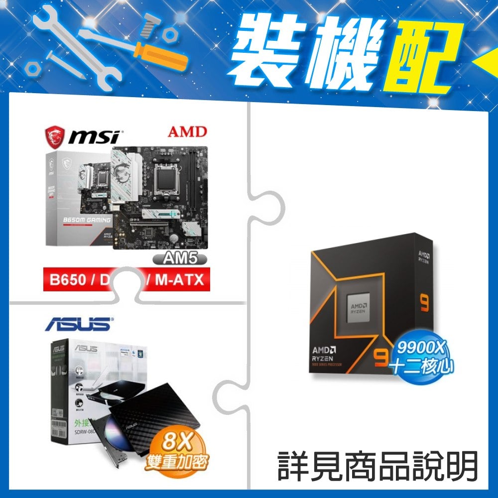☆裝機配★ AMD R9 9900X+微星 B650M GAMING WIFI M-ATX主機板+華碩 SDRW-08D2S-U 外接式燒錄機《黑》
