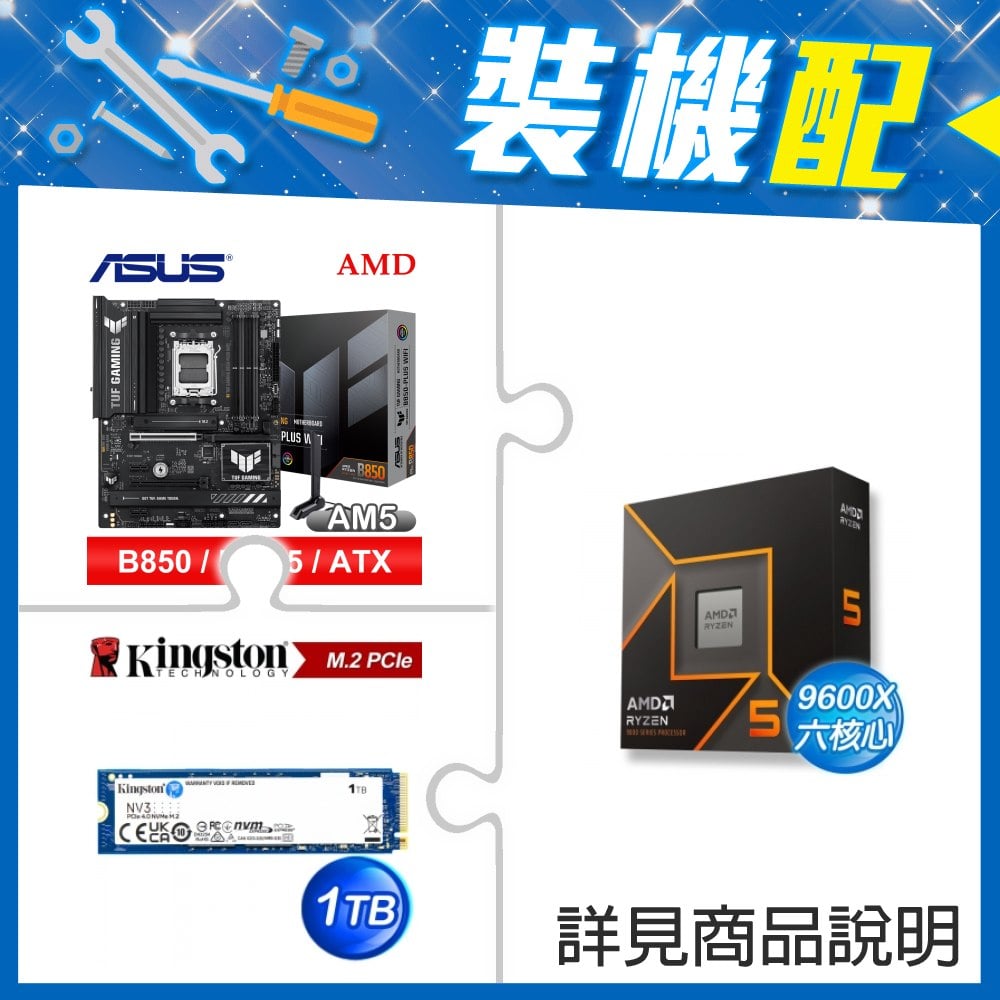 ☆裝機配★ AMD R5 9600X+華碩 TUF GAMING B850-PLUS WIFI ATX主機板+金士頓 NV3 1TB M.2 PCIe SSD