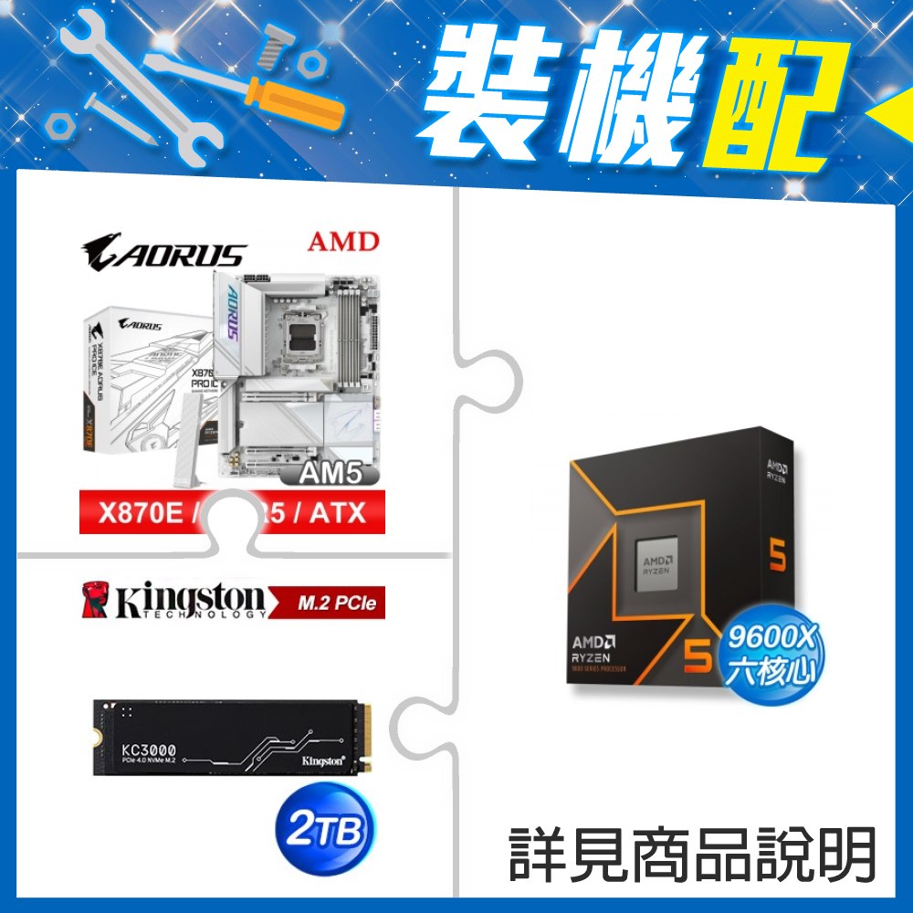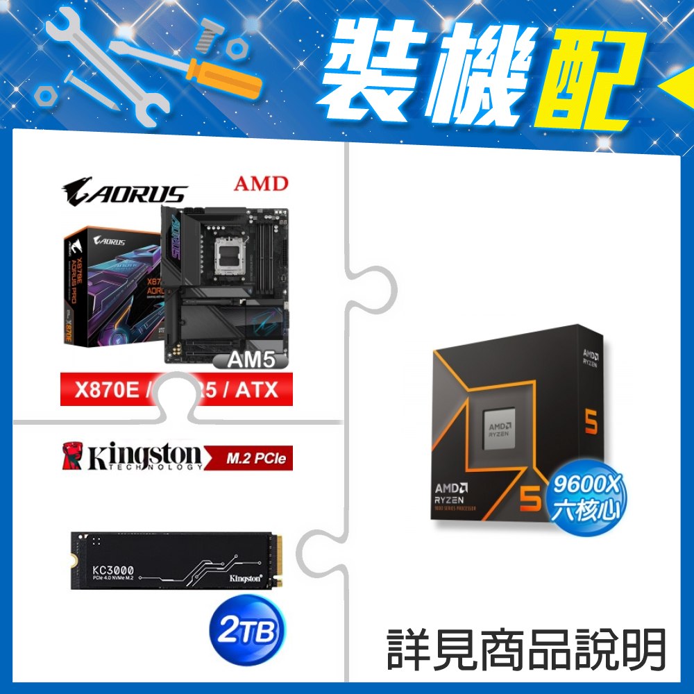 ☆裝機配★ AMD R5 9600X+技嘉 X870 AORUS ELITE WIFI7 ATX主機板+金士頓 KC3000 2TB PCIe 4.0 NVMe M.2 SSD