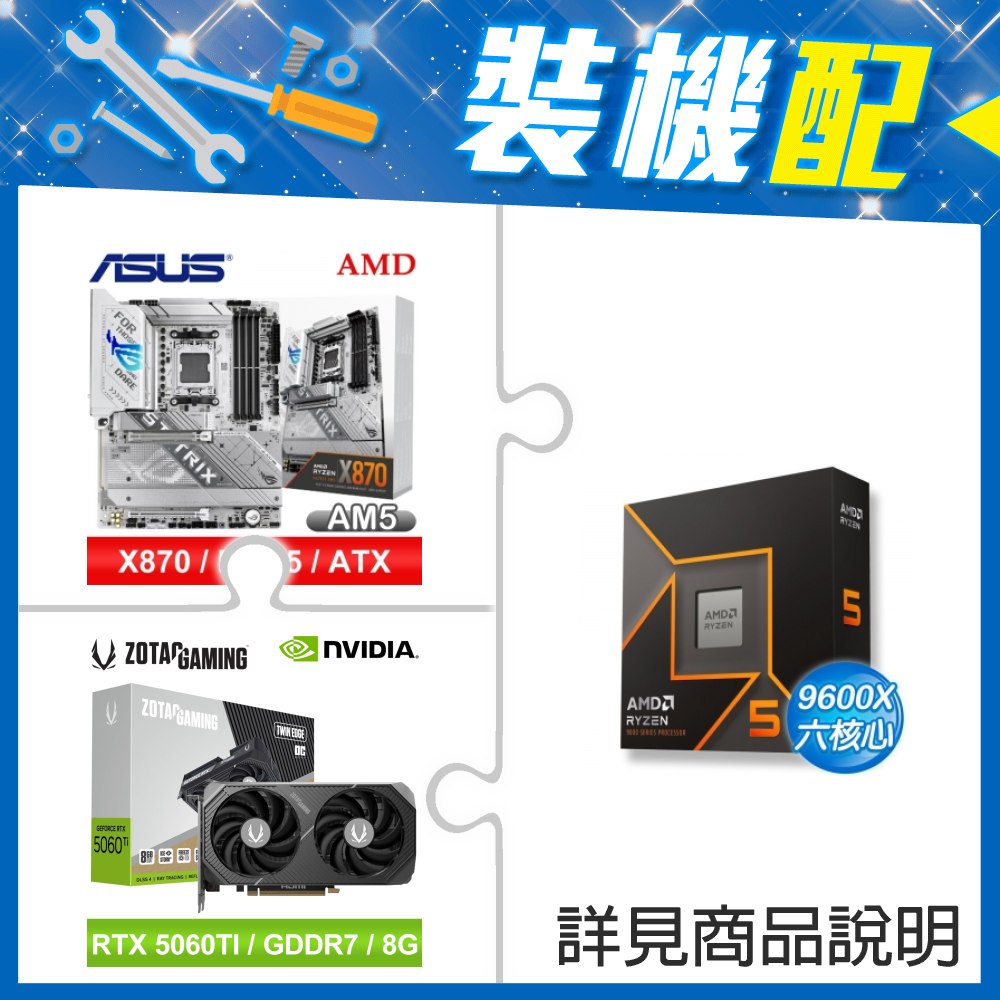 ☆裝機配★ AMD R5 9600X+華碩 ROG STRIX X870-A GAMING WIFI ATX主機板+索泰 RTX 5060 TI 8GB Twin Edge OC 顯示卡