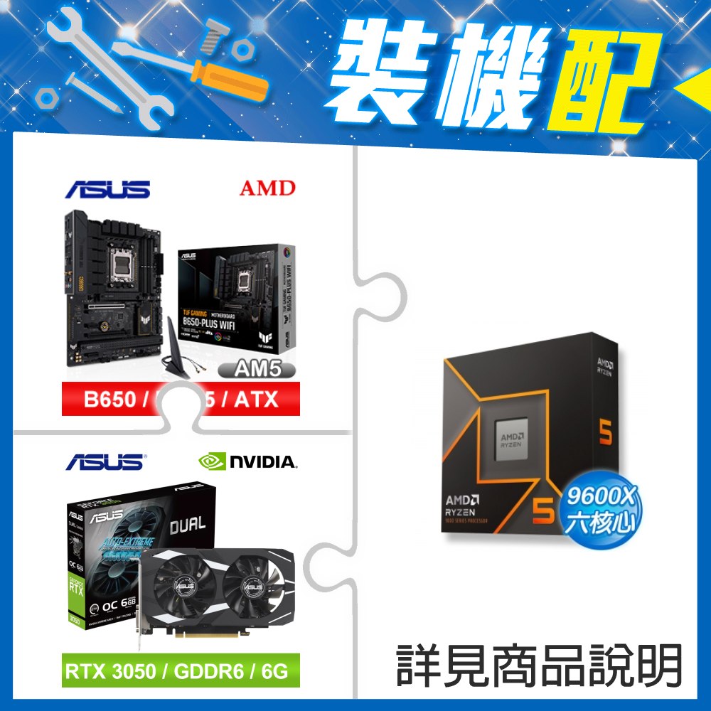 ☆裝機配★ AMD R5 9600X+華碩 TUF GAMING B650-PLUS WIFI ATX主機板+華碩 DUAL-RTX3050-O6G 顯示卡