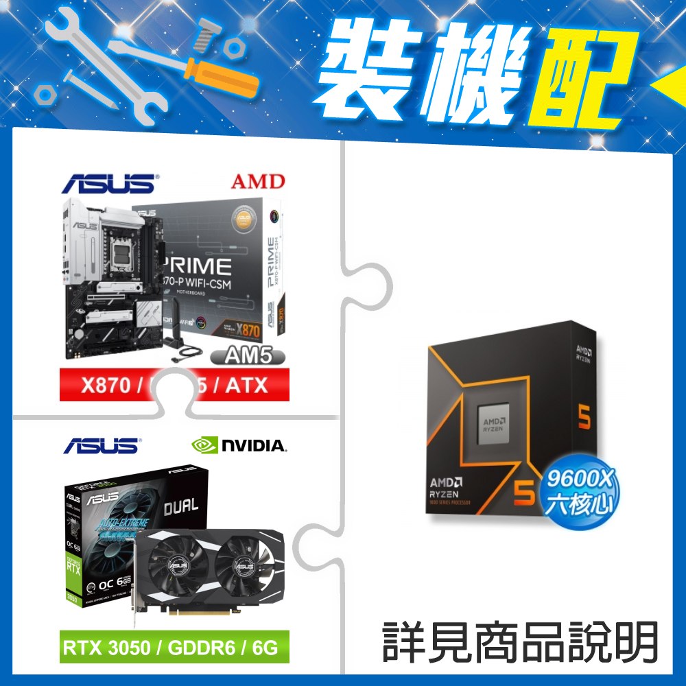 ☆裝機配★ AMD R5 9600X+華碩 PRIME X870-P WIFI-CSM ATX主機板+華碩 DUAL-RTX3050-O6G 顯示卡