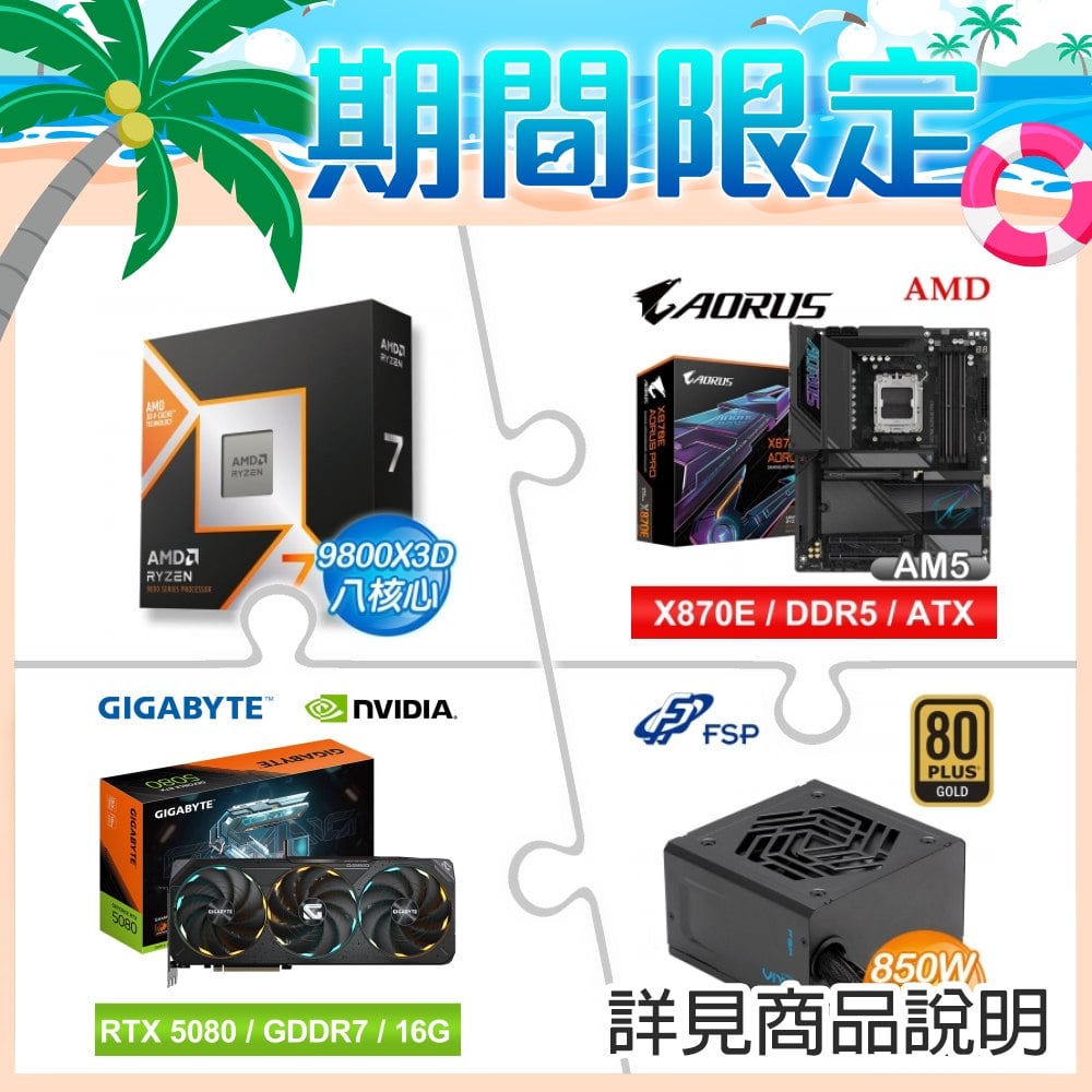 ☆期間限定★ AMD R7 9800X3D+技嘉 X870E AORUS PRO ATX主機板+技嘉 RTX 5080 GAMING OC 16G 顯示卡+全漢 VITA-850GD(MIT) 金牌 直出 主日系 ATX3.1電源供應器