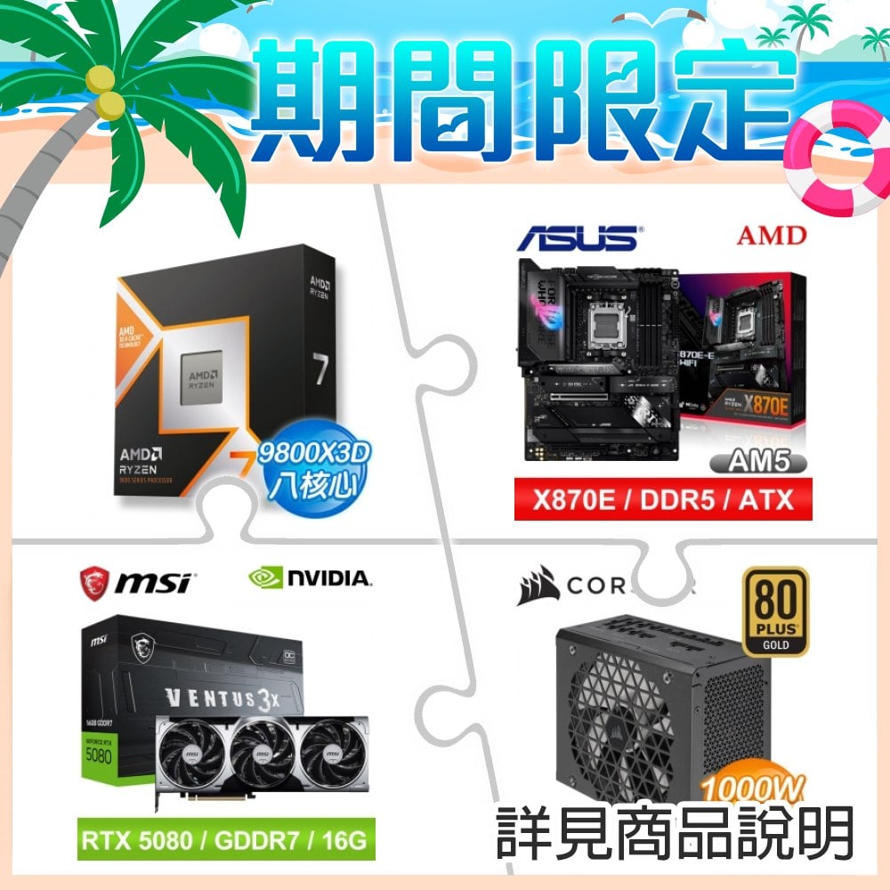☆期間限定★ AMD R7 9800X3D+華碩 ROG STRIX X870E-E GAMING WIFI ATX主機板+微星 RTX 5080 16G VENTUS 3X OC PLUS 顯示卡+海盜船 RM1000x SHIFT 金牌 全模組 ATX3.1電源供應器