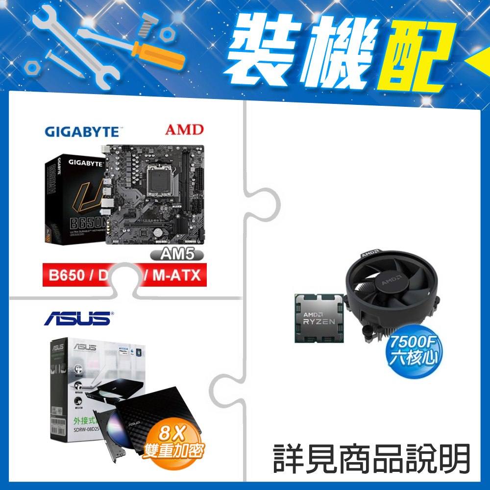 ☆裝機配★ AMD R5 7500F+技嘉 B650M H MATX主機板+華碩 SDRW-08D2S-U 外接式燒錄機《黑》