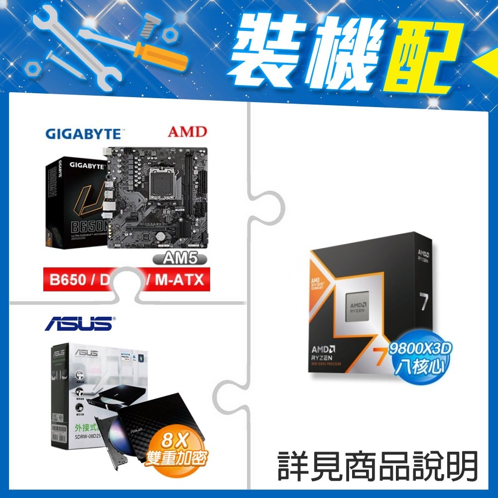 ☆裝機配★ AMD R7 9800X3D+技嘉 B650M H MATX主機板+華碩 SDRW-08D2S-U 外接式燒錄機《黑》