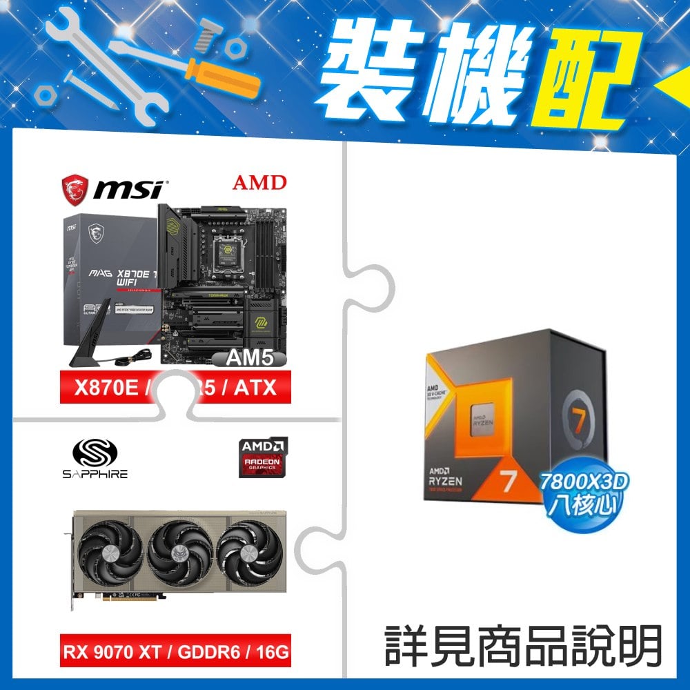 ☆裝機配★ AMD R7 7800X3D+微星 MAG X870E TOMAHAWK WIFI ATX主機板+藍寶石 NITRO+ 氮動 RX 9070 XT GAMING OC 16GB 顯示卡