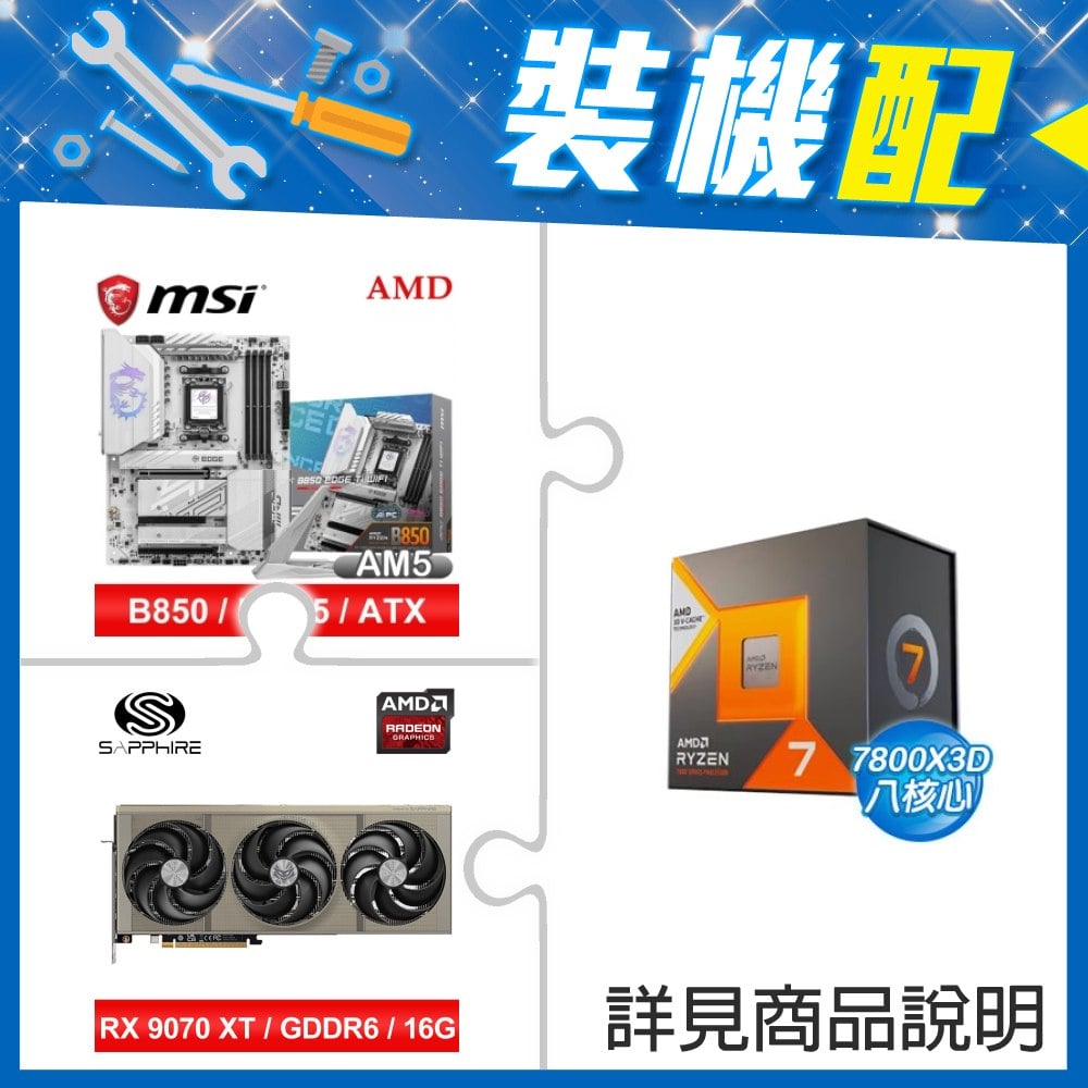☆裝機配★ AMD R7 7800X3D+微星 MPG B850 EDGE TI WIFI ATX主機板+藍寶石 NITRO+ 氮動 RX 9070 XT GAMING OC 16GB 顯示卡