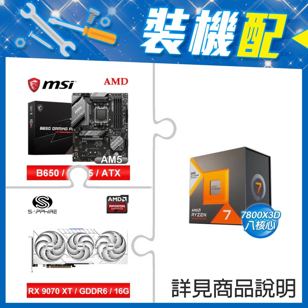 ☆裝機配★ AMD R7 7800X3D+微星 B650 GAMING PLUS WIFI D5 ATX主機板+藍寶石 PURE 極地 RX 9070 XT GAMING OC 16GB 顯示卡