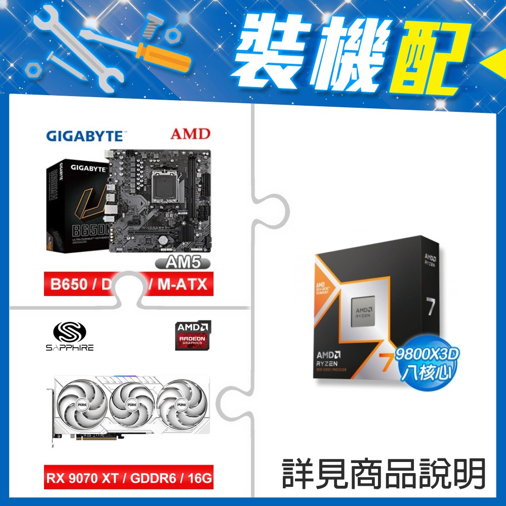 ☆裝機配★ AMD R7 9800X3D+技嘉 B650M H MATX主機板+藍寶石 PURE 極地 RX 9070 XT GAMING OC 16GB 顯示卡