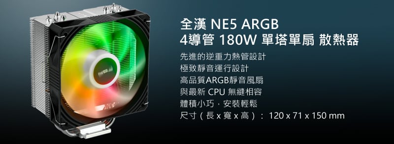 - CPU散熱風扇:全漢 NE5 ARGB 4導管 180W 單塔單扇