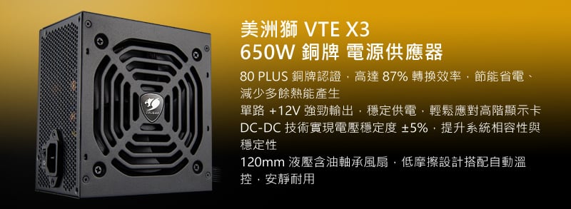 - 電源供應器:COUGAR 美洲獅 VTE X3 650W 銅牌