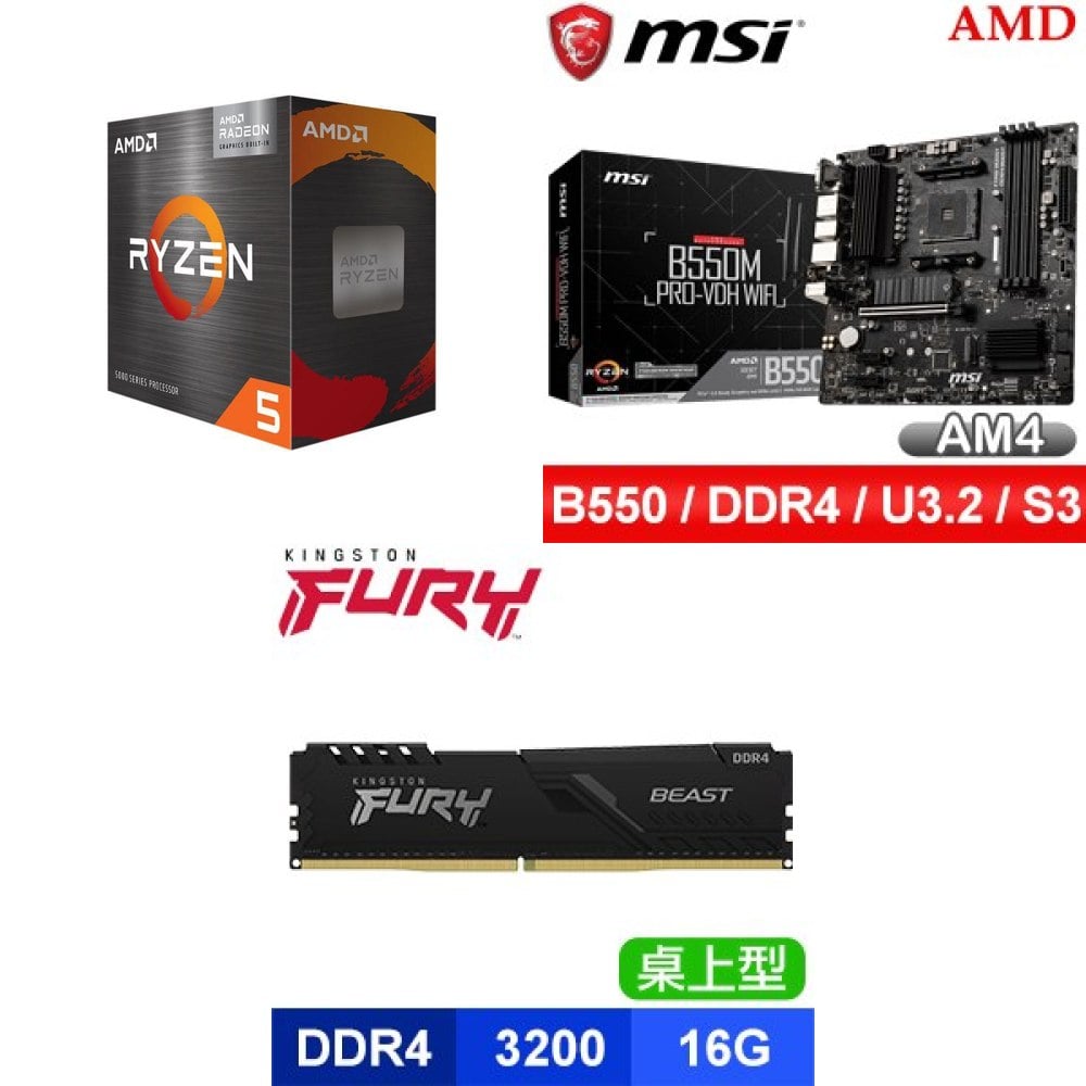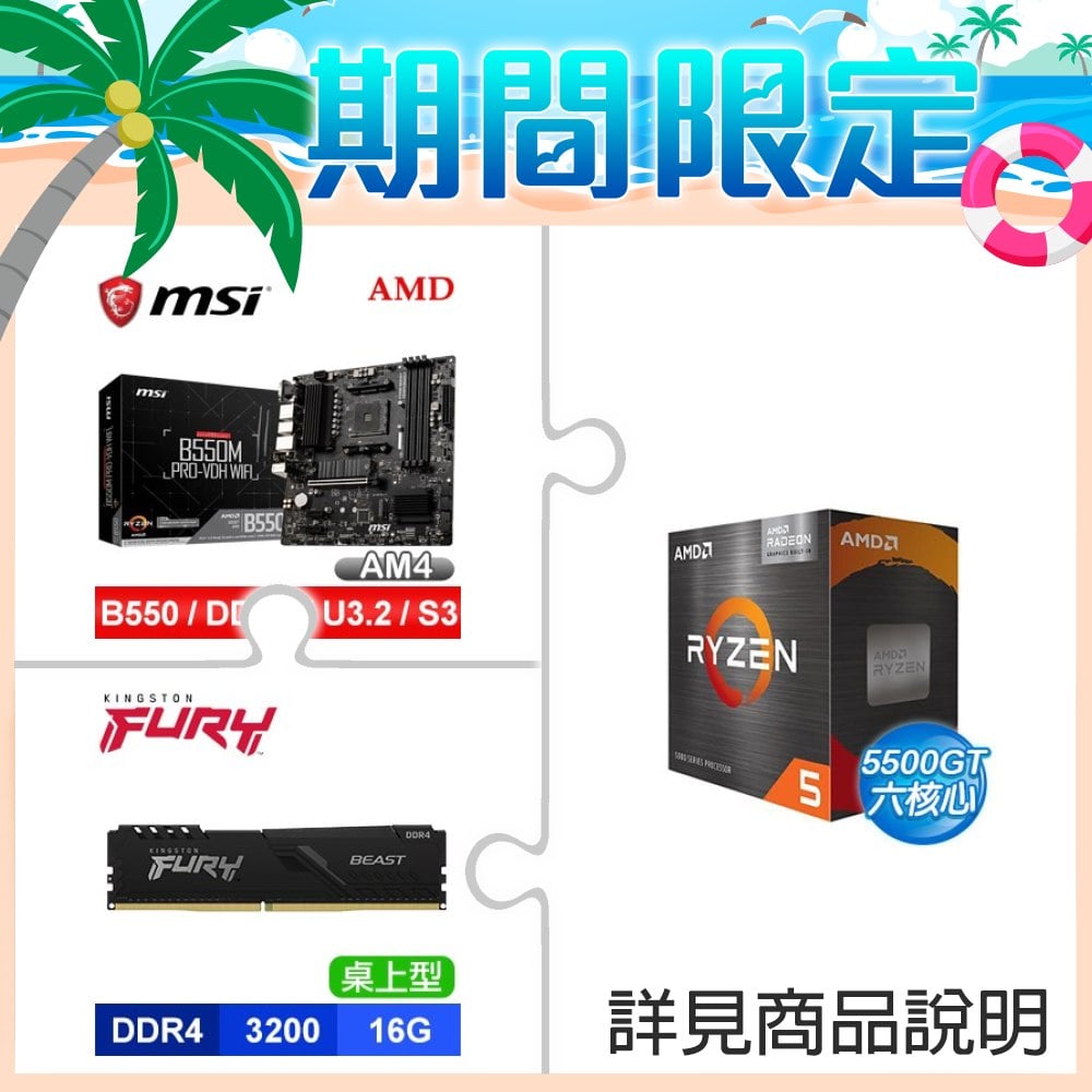 ☆期間限定★ AMD R5 5500GT+微星 B550M PRO-VDH WIFI M-ATX主機板+金士頓 FURY Beast 獸獵者 DDR4-3200 16GB CL16 記憶體《黑》