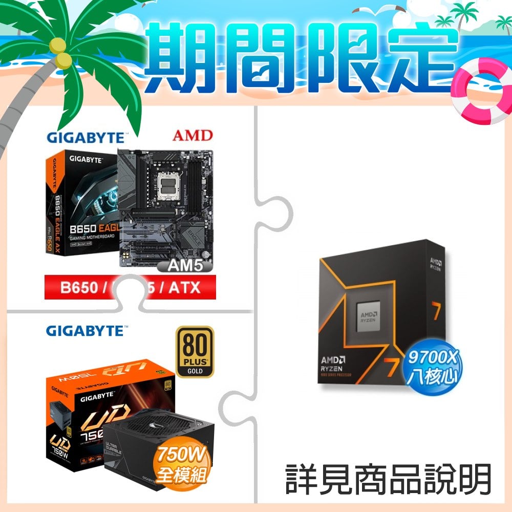☆期間限定★ AMD R7 9700X+技嘉 B650 EAGLE AX D5 ATX主機板+技嘉 UD750GM 金牌 全模組 電源供應器