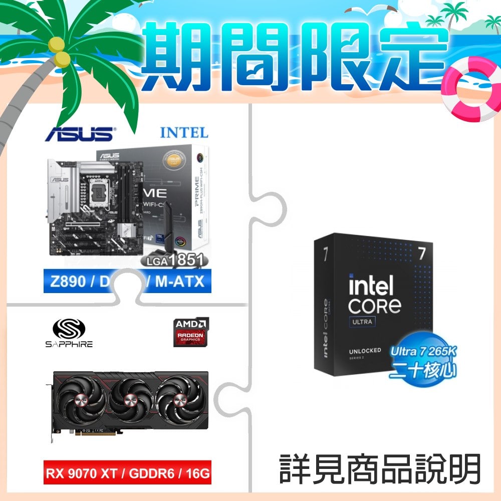 ☆期間限定★ Intel Core Ultra 7 265K+華碩 PRIME Z890M-PLUS WIFI-CSM D5 M-ATX主機板+藍寶石 PULSE 脈動 RX 9070 XT GAMING 16GB 顯示卡