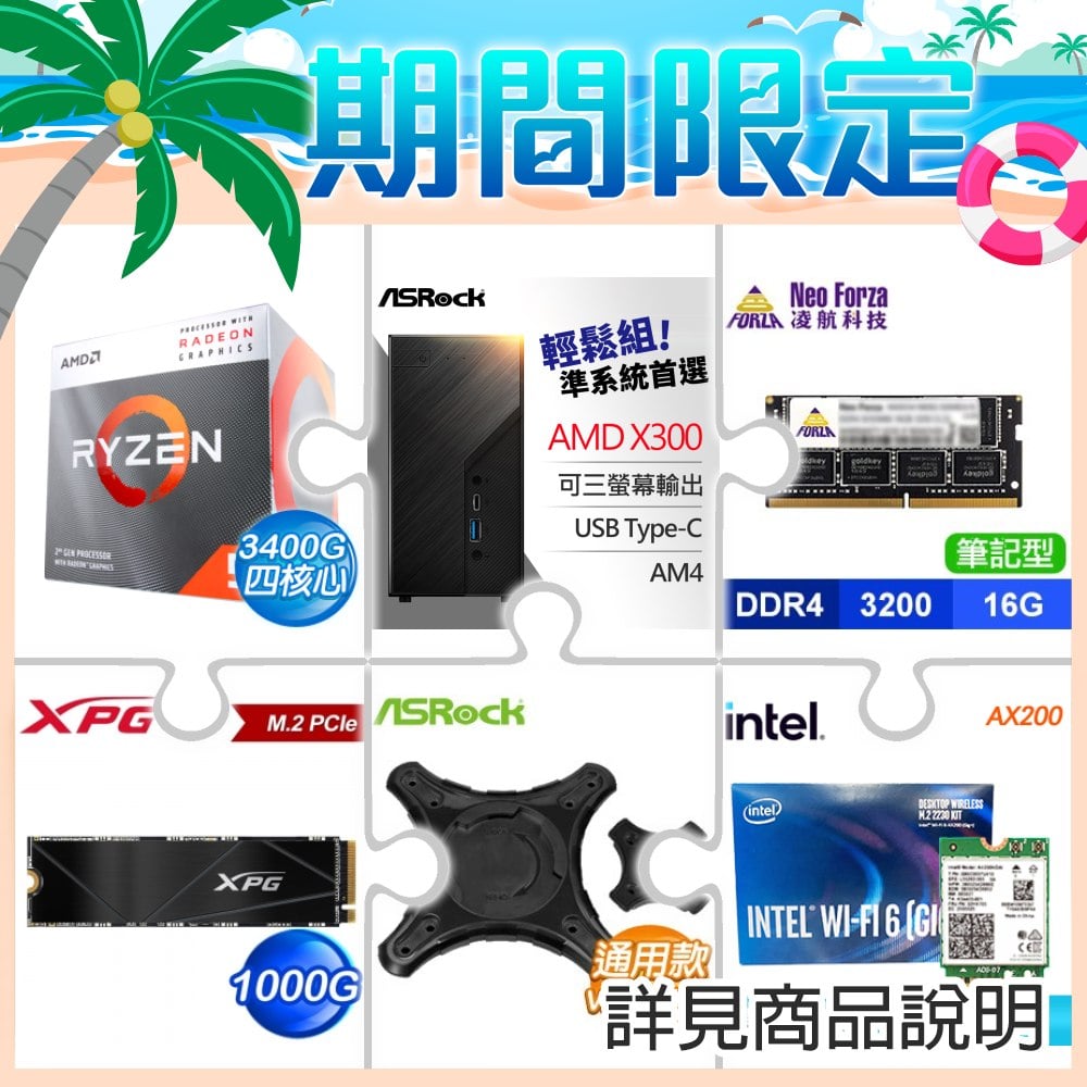 ☆期間限定★ AMD R5 3400G+華擎Deskmini X300 Mini-STX準系統(含風扇)+凌航 NB DDR4-3200 16G 記憶體(1024*8)+威剛 XPG GAMMIX S50 Core 1000G PCIe 4.0 Gen4x4 M.2 SSD+華擎 DeskMini VESA 後背安裝支架+Intel AX200 Wi-Fi 6 (Gig+) M.2無線網卡