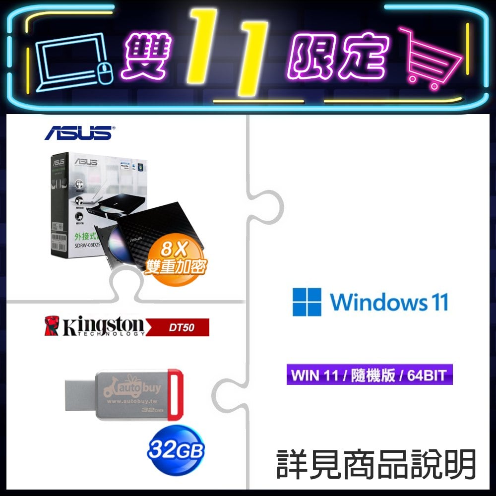 ☆期間限定★ Windows 11 64bit 隨機版《含DVD》+華碩 外接燒錄器《黑》(SDRW-08D2S-U)+金士頓 DT50 32GB 隨身碟《Autobuy限定款》