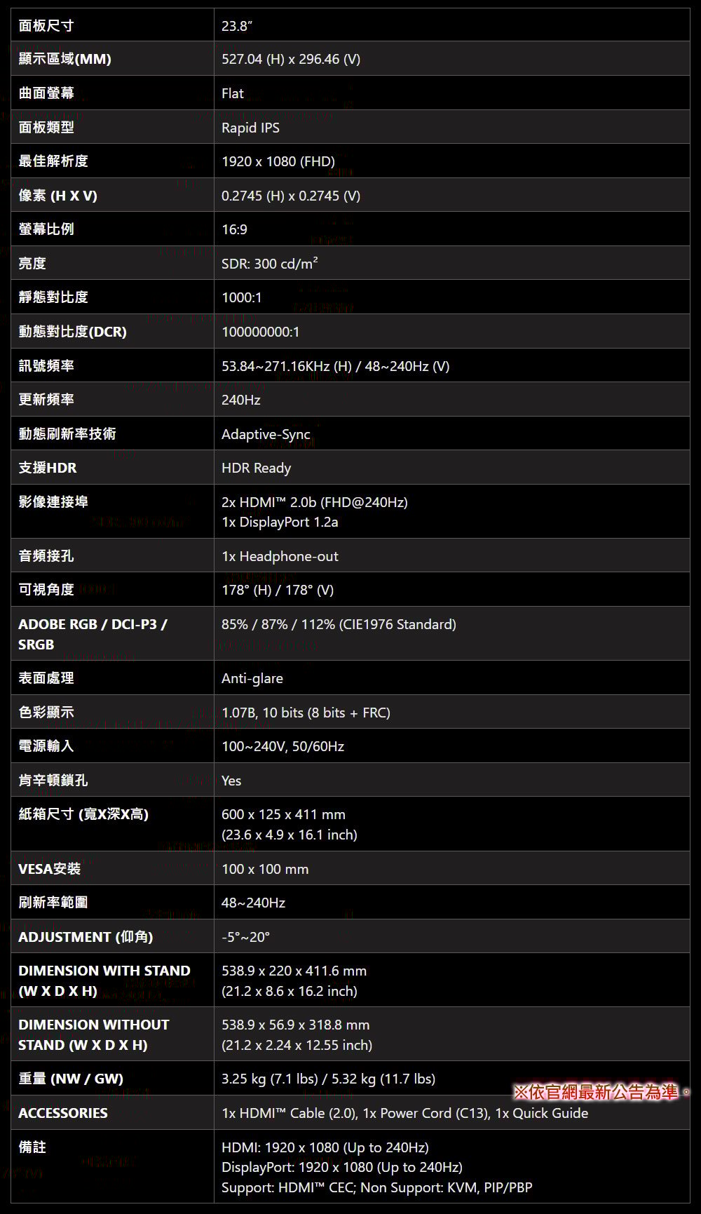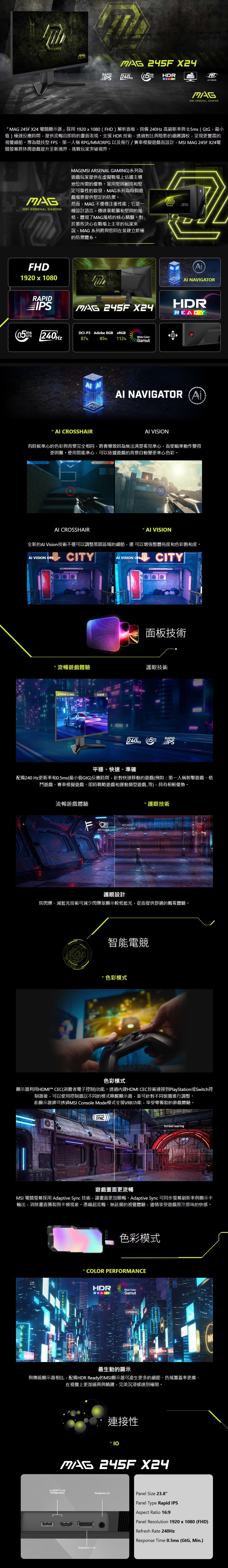 - Rapid IPS 面板-提供 0.5ms(GtG,最小值)快速反應時間,優化螢幕顏色和亮度