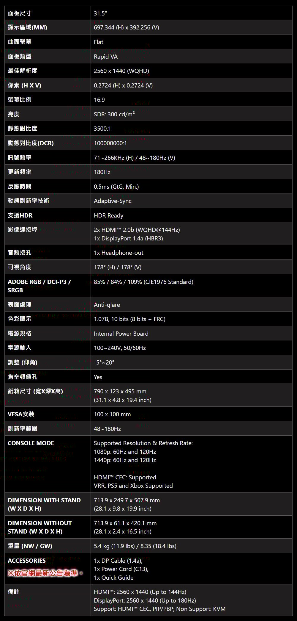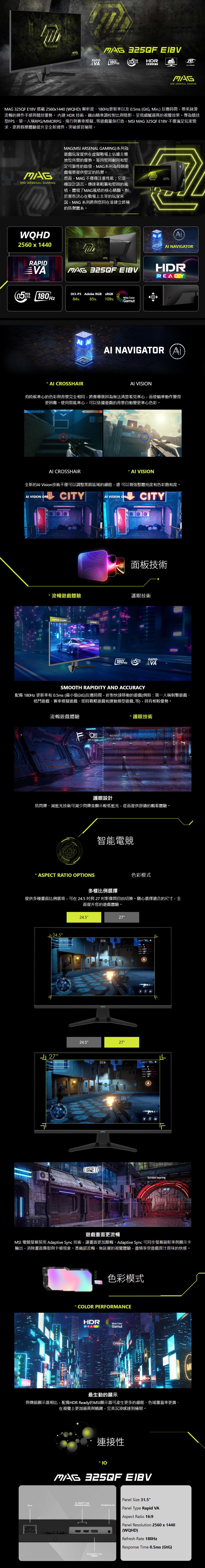 - Rapid VA 面板-提供 0.5ms(GtG,最小值)快速反應時間,優化螢幕顏色和亮度