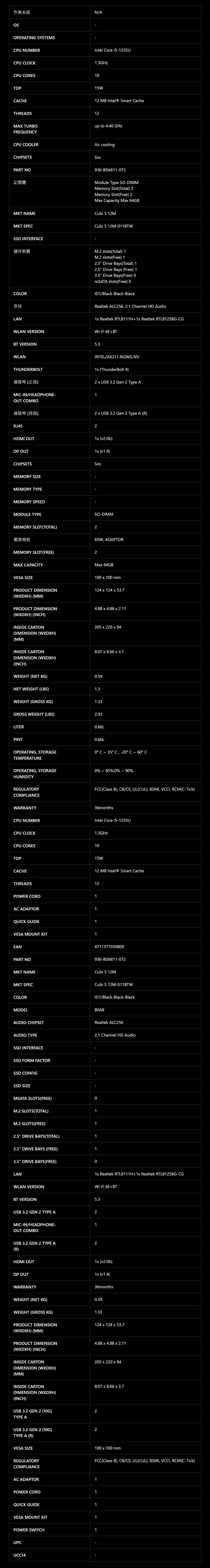 MSI 微星 Cubi 5 12M-012BTW-B31215UXX 準系統