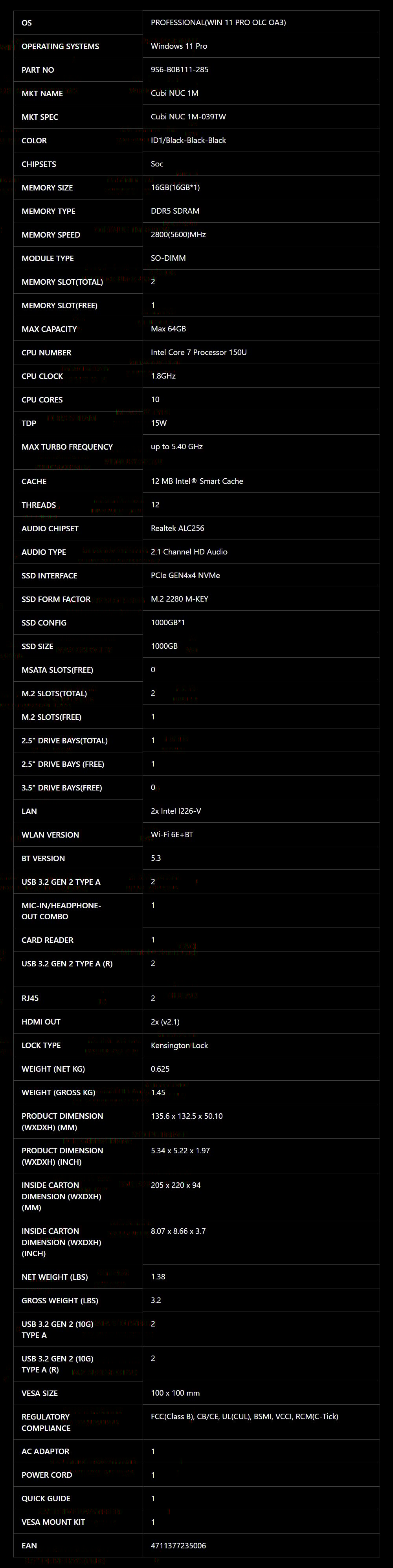 MSI 微星 Cubi NUC AI 1UMG-040BTW-B7155HXX 準系統