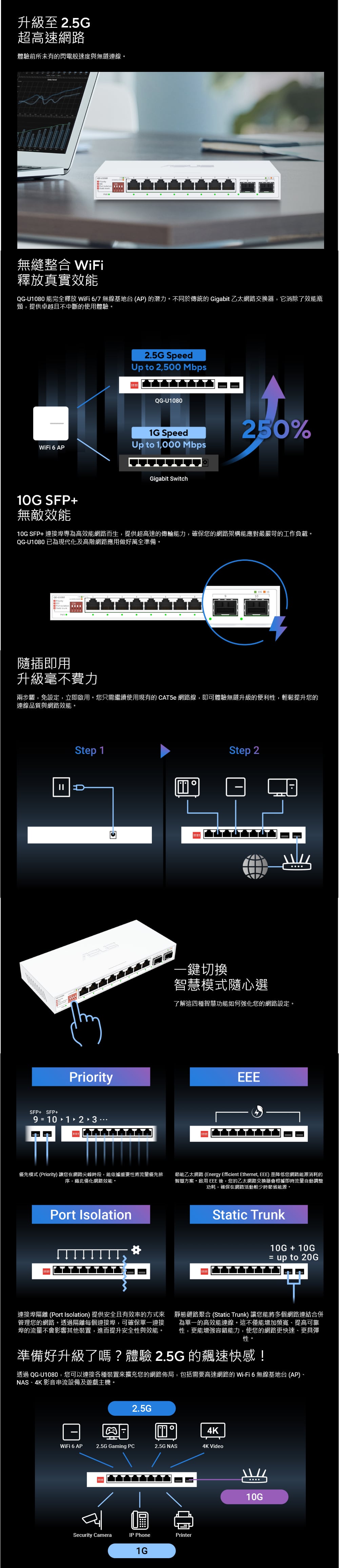 - 支援四種智慧功能 – 流量優先、EEE 節能、連接埠隔離與靜態鏈路聚合。一機滿足您保護及優化家庭或商用網路的所有需求