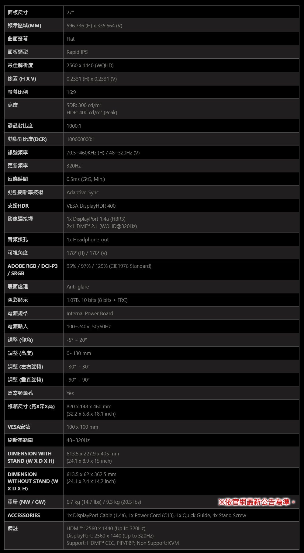 - 320Hz 更新率 – 反應速度更快,畫面更流暢