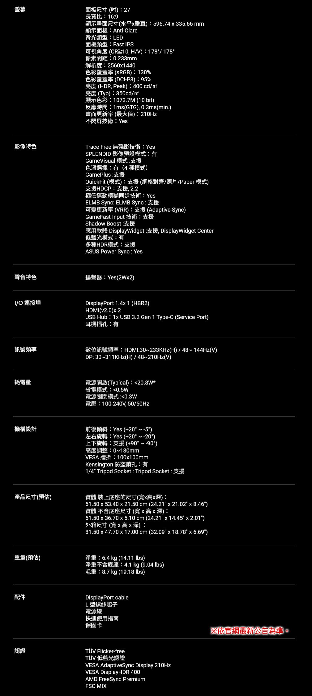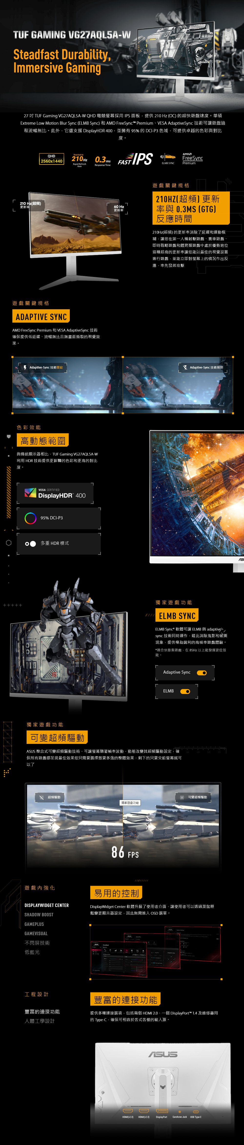 - 27 吋 QHD(2560x1440) Fast IPS 電競螢幕,具備 210Hz (超頻) 更新率,專為職業玩家和沈浸式遊戲而設計