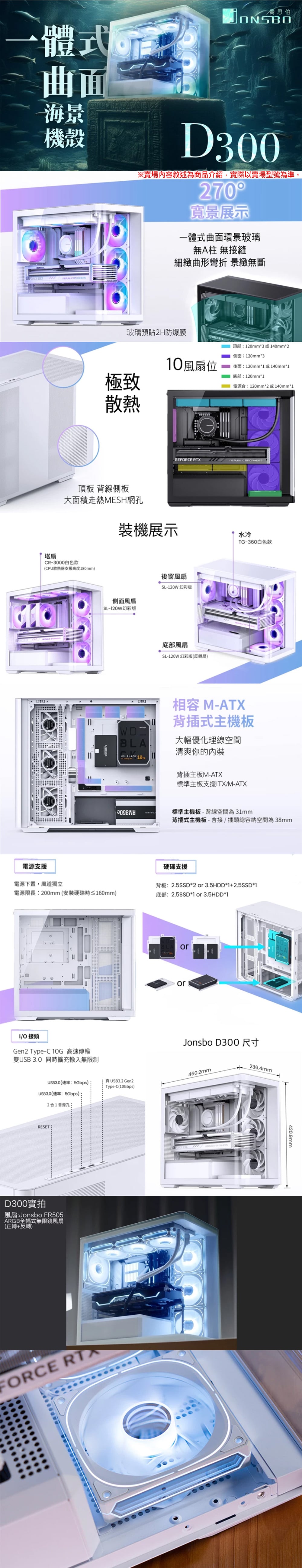 JONSBO 喬思伯【D300 台灣版】一體式曲面環景玻璃透側 支援背插主機板 M-ATX機殼《白》(顯卡43/CPU高18)