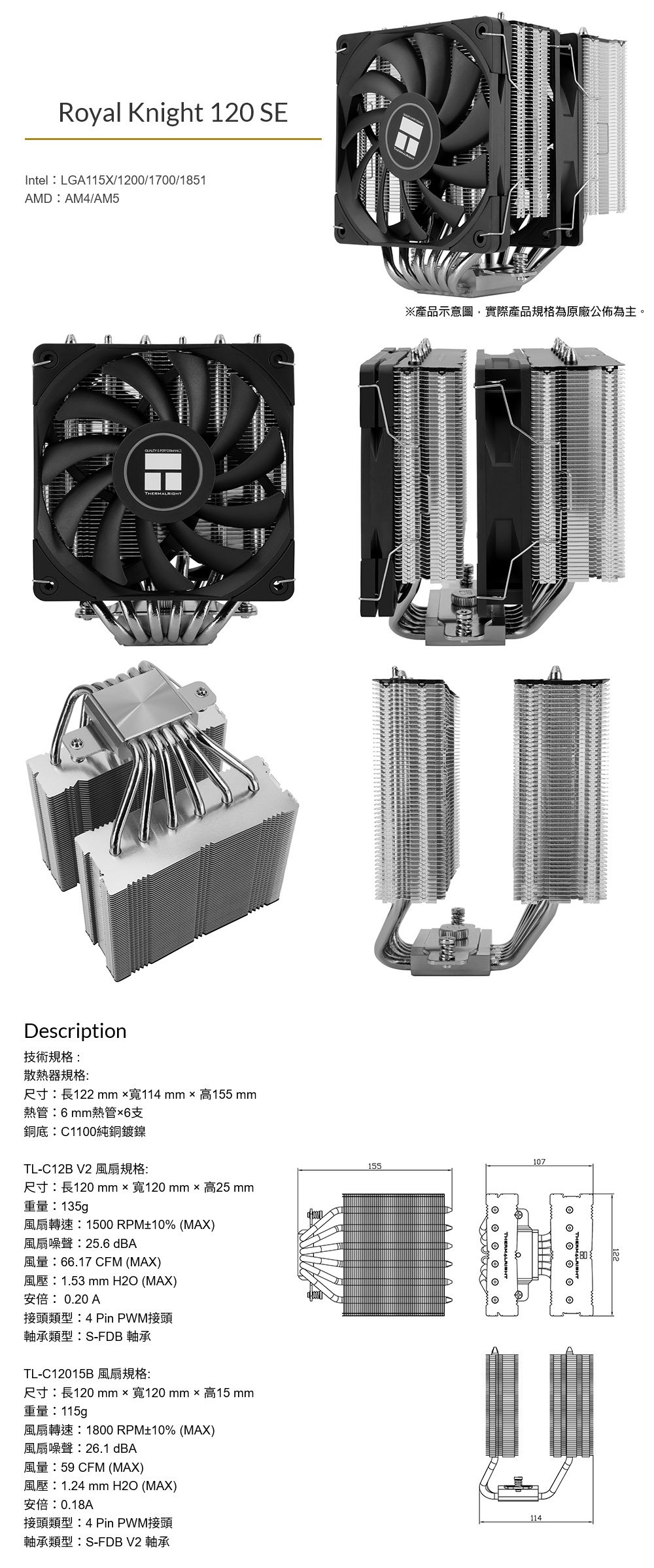 Thermalright 利民 Royal Knight 120 6導管 280W H12-X28+H12015B 雙塔雙扇 CPU散熱器(高15.6)