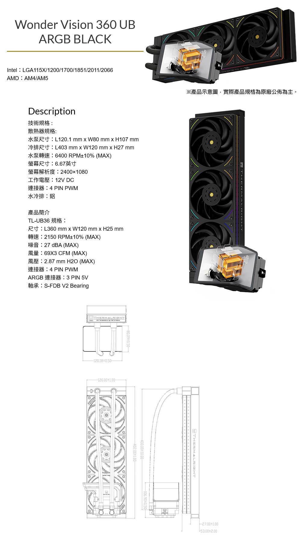 Thermalright 利民 Wonder Vision 360 UB ARGB Black 曲面一體式水冷散熱器(6年非人損漏液保)