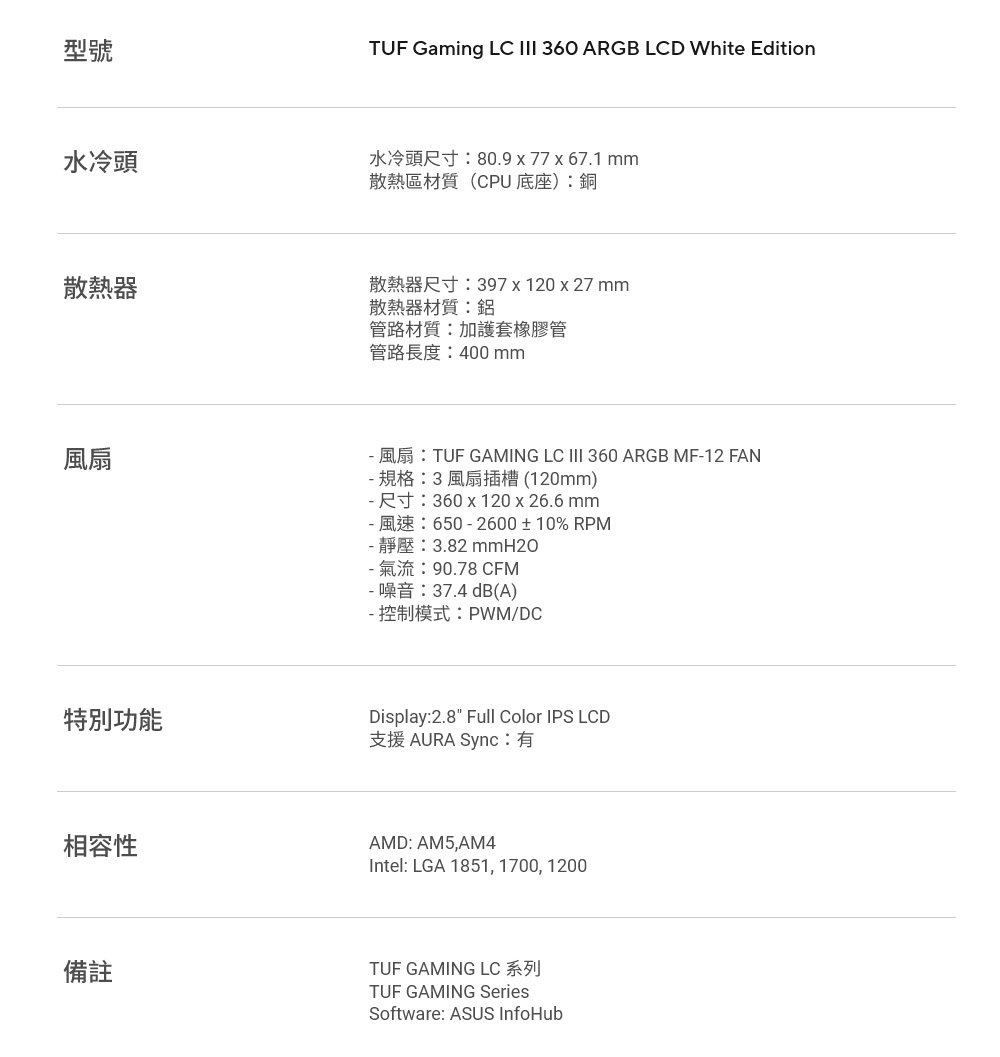 ASUS 華碩 TUF GAMING LC III 360 ARGB WHT 軍戎白 水冷散熱器(6年非人損漏液保換新)