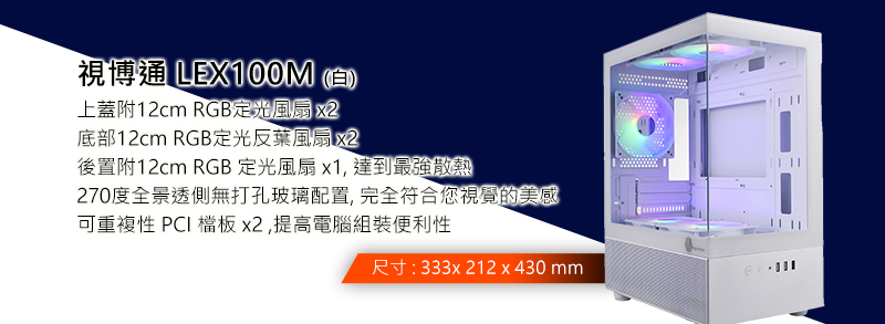 • 電腦機殼:視博通 LEX100M 全景玻璃透側 M-ATX 白